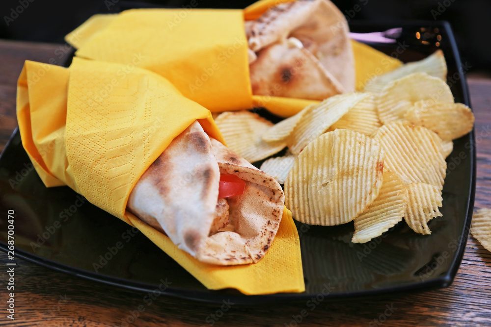 arabic pita with chicken, cheese, tomato and potato chips - breakfast, brunch plate