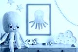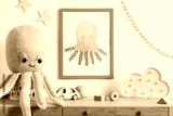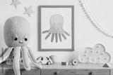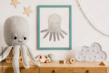 Stylish and cozy childroom with white mock up photo frame, wooden accessories, toys, clouds, plush octopus and white garland and stars on the wall. Bright and sunny interior. Template, Real photo.