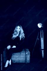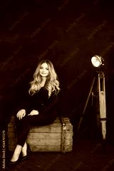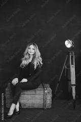 Young blonde model woman with blue eyes in dark blue suit sits on the wooden chest at the dark interior