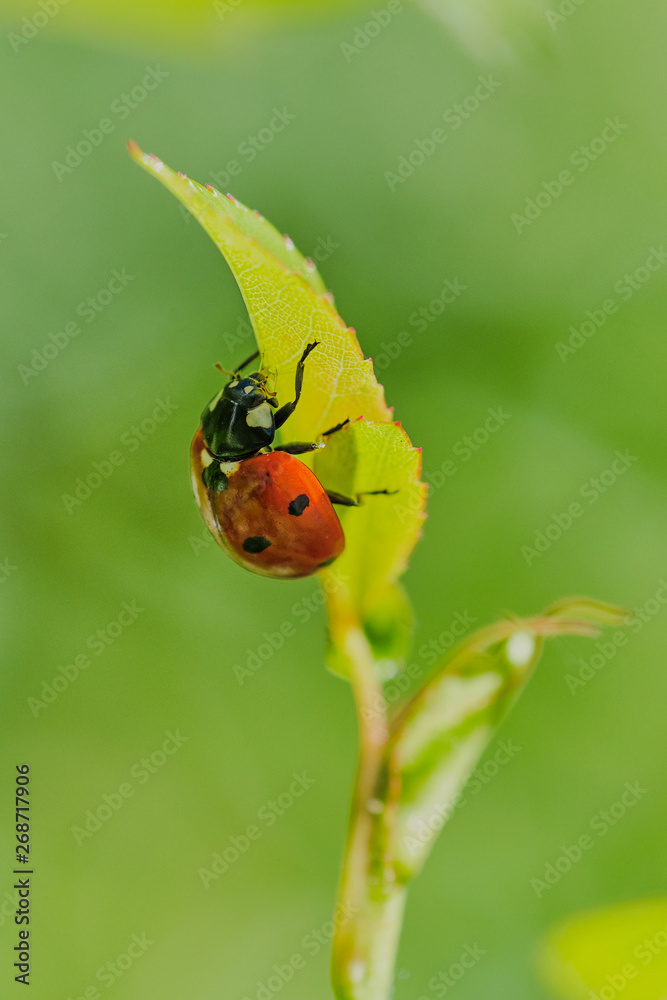 ladybug is eating a greenfly on a leaf of a rose, vertical color macro photo