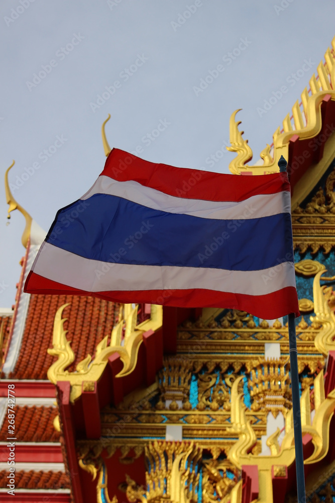 The Thailand national flag flies in front of a traditional Buddhist temple building and blue sky background.