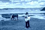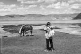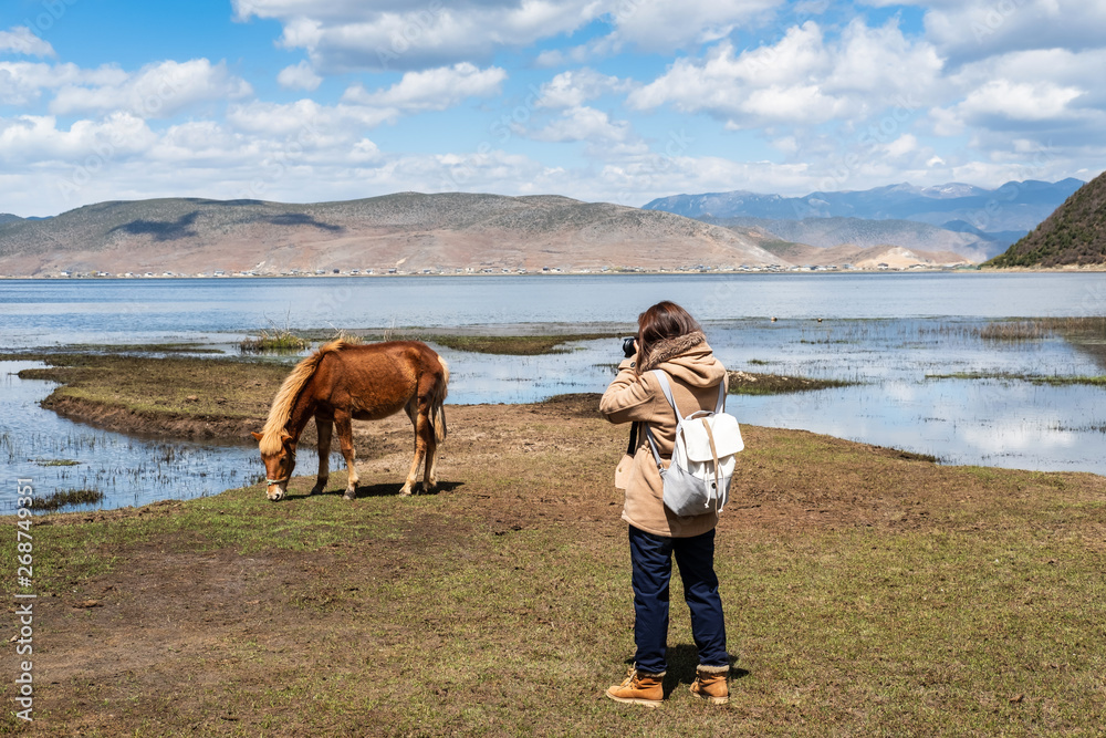 Young woman traveler taking a picture of horse in Napa Lake Grassland at Shangri-La Yunnan