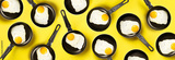 Creative food pattern with fried eggs on pans over yellow background. Top view. Creative pattern in minimal style. Flat lay. Banner