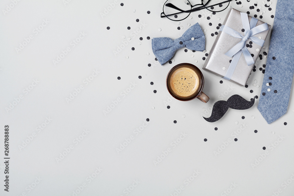 Greeting card with holiday breakfast on Happy Fathers Day with cup of coffee, gift box, glasses, bowtie and moustache top view. Flat lay.