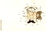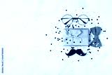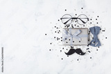 Gift or present box, bowtie, moustache, glasses and confetti for Happy Father day. Top view and flat lay.
