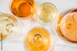 Trendy orange wine, with white wine in different glasses, white concrete background copy space