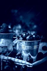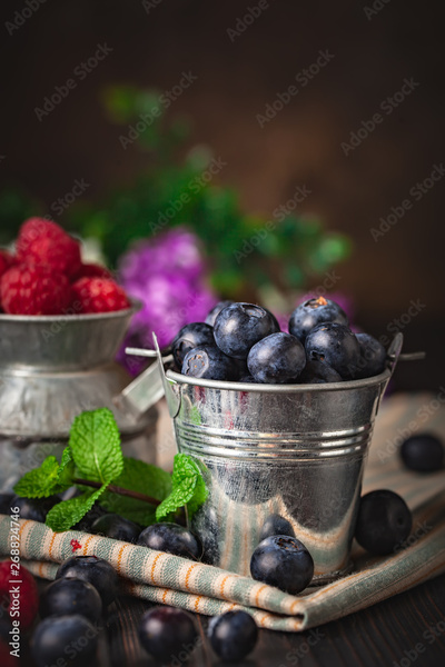 Raspberries and blueberries in a Cup on a dark background. Summer and healthy food concept. Background with copy space. Selective focus. Vertical.