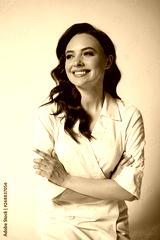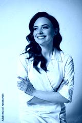 Happy beautiful young female doctor in white medical jacket isolated on white background. Brunette woman cosmetologist. Cross hands. Medical concept. Healthcare