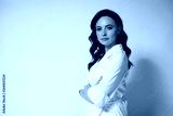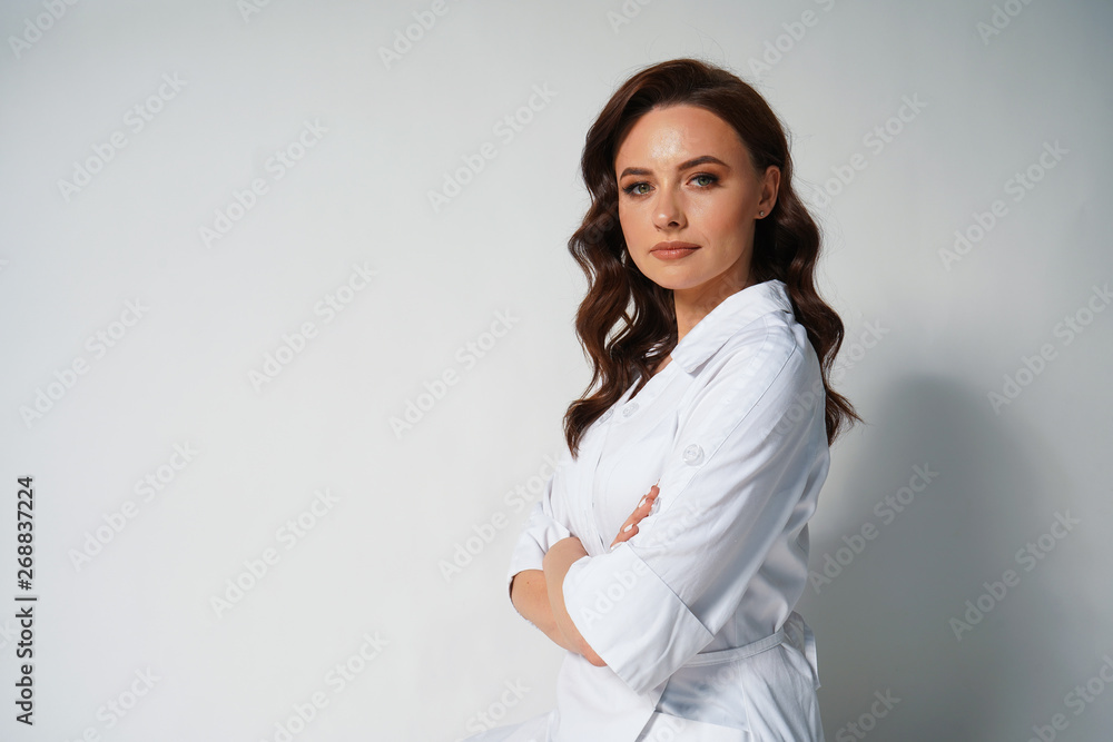 Attractive young professional doctor in white medical jacket isolated on white background. Brunette woman cosmetologist. Cross hands. Space for text. Portrait shot