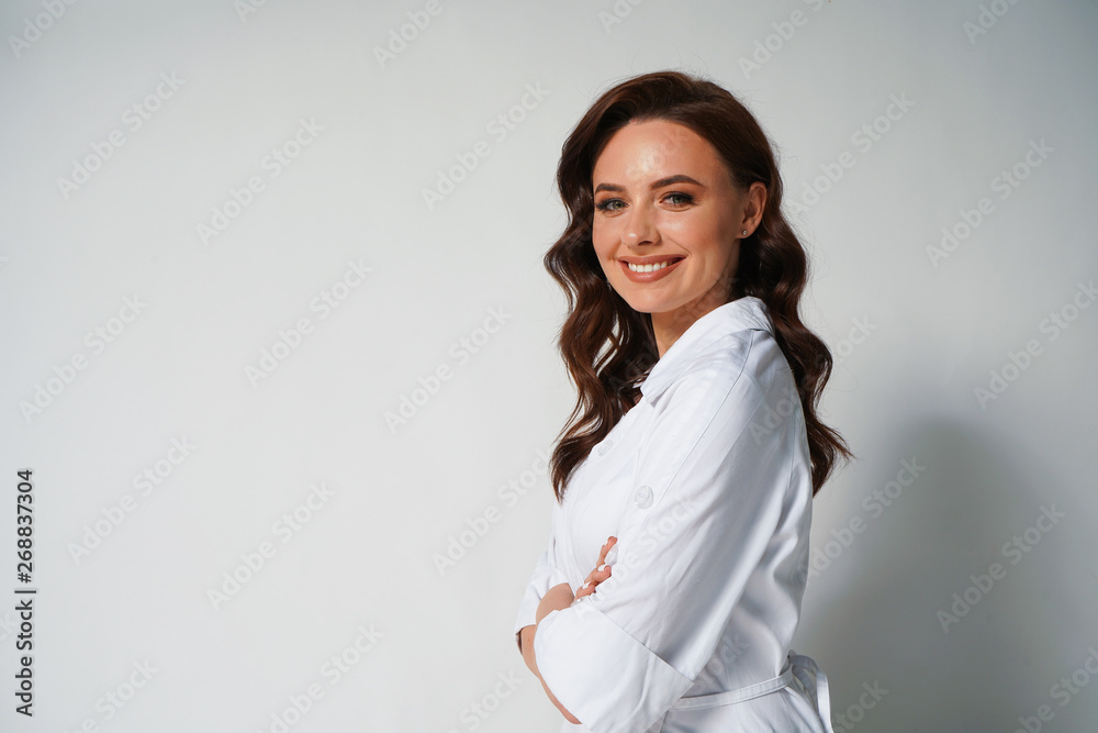 Portrait of attractive young professional doctor in white medical jacket isolated on white background. Smiling woman with crossed hands. Space for text. Medical concept. Healthcare
