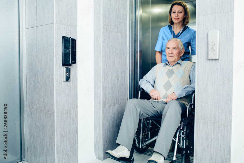 Thoughtful nurse pushing senior patient in wheelchair at hospital lift