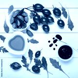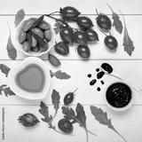set seen from above, on the white wooden table some leaves of rocket, cherry tomatoes, bowls with olive oil and green olives and balsamic vinegar glaze.