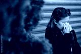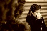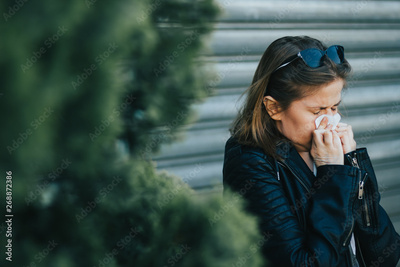 Young woman with brown hair wearing a leather jacket and sunglasses blowing her nose with her eyes closed in a white napkin outdoor – Concept image for allergies