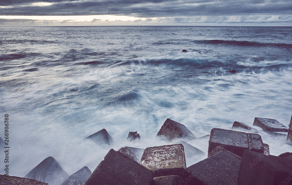Scenic sunset in Puerto de la Cruz, color toned long exposure picture, Tenerife, Spain.