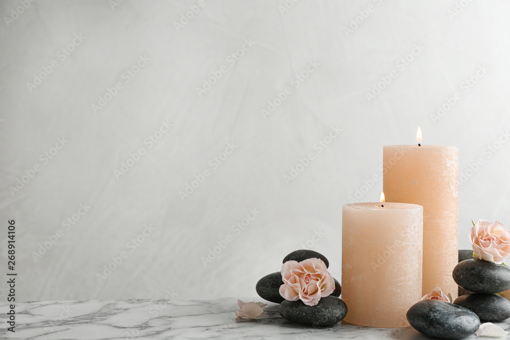 Composition of burning candles, spa stones and flowers on table. Space for text