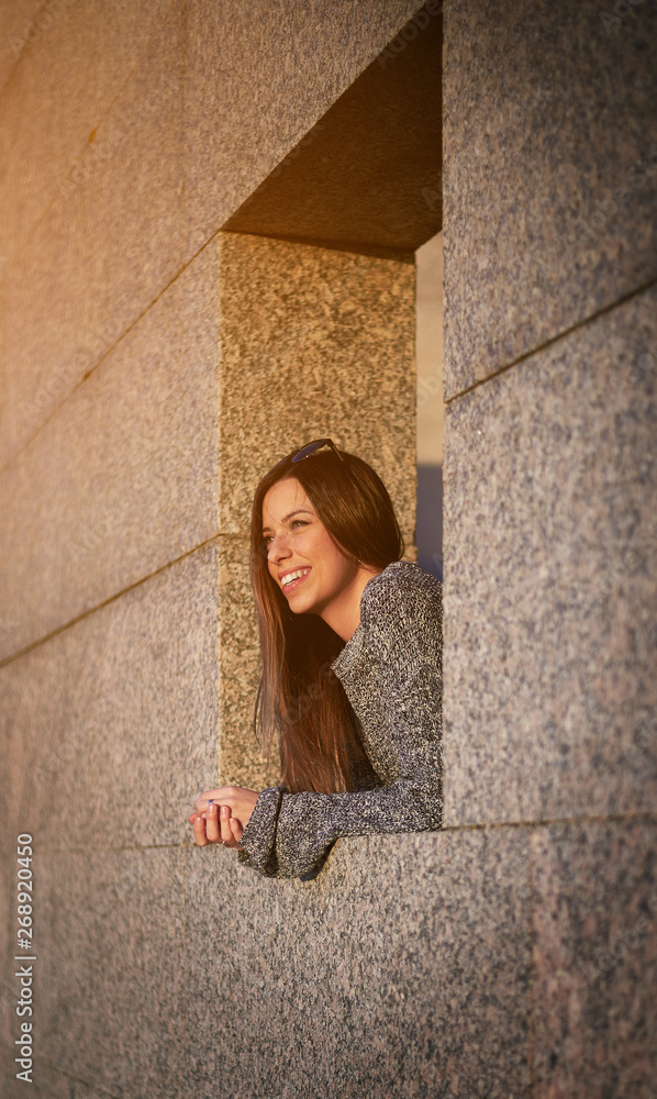Young woman enjoying the sunlight in a square shaped window made of rock