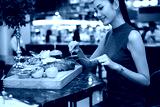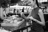 Working Asian Woman Black hair having Lunch big piece Steak grill Dinner of Western food in fusion restaurant cafe and eat alone. Concept enjoy eating myself for good food life