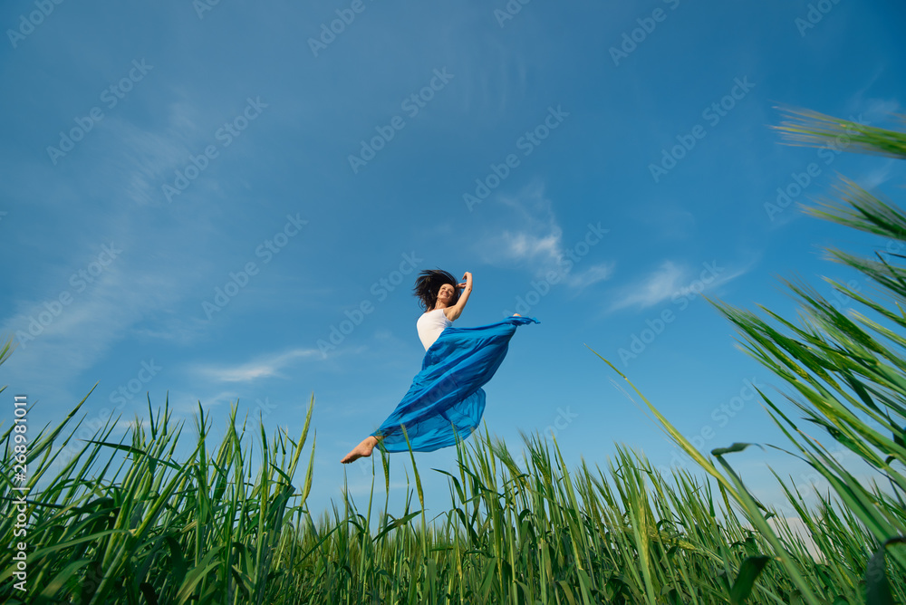 Flying dancer in the air. Happy woman ballerina in blue fabric skirt making a big jump on Green field. Summer or Spring concept
