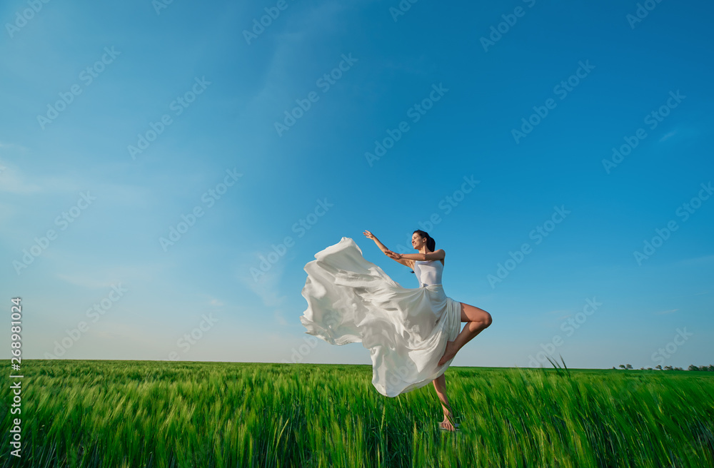 Flying dancer in the air. Happy woman ballerina in white fabric skirt posing on Green field. Summer or Spring concept