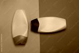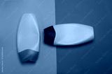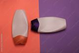 Beauty, decorative cosmetics bottles. Peach and purple colors background, flat lay, top view, minimalistic pop-art style