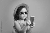 Little girl makes a selfie portrait on phone, pulls her lips to the camera, wears a straw hat and sunglasses, dressed in blue dress, stands on isolated pink.