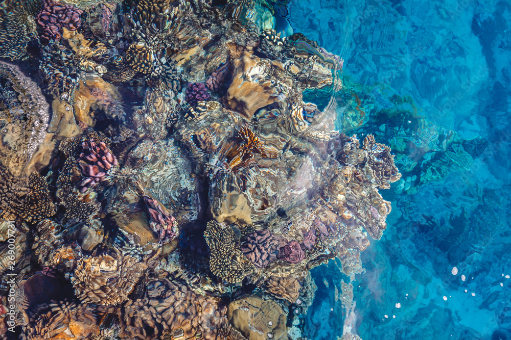 Bright coral reef with colorful fish of the Red Sea in Egypt. View from above.