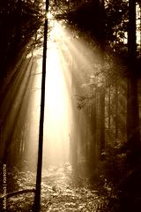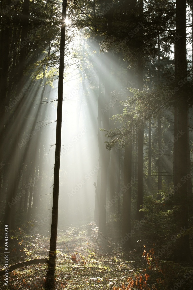 Misty coniferous forest backlit by the morning sunlight