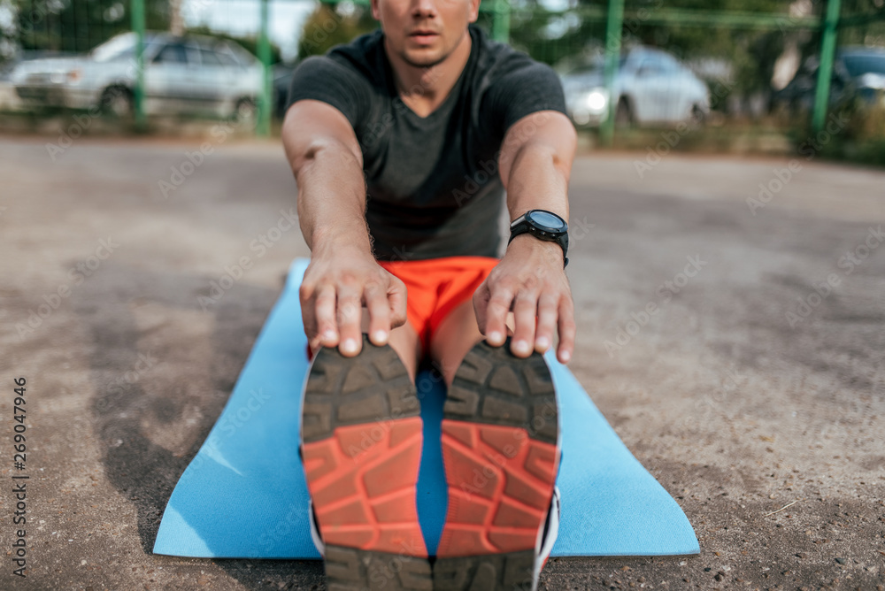 A man athlete doing workout on mat, gymnastics, training, fitness workout flexibility. Summer city on background athletic field. Active lifestyle youth, close-up hand sneakers smart bracelet watches.