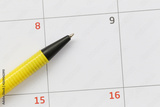 Yellow pen is placed on the calendar in the 9th day and have copy space.