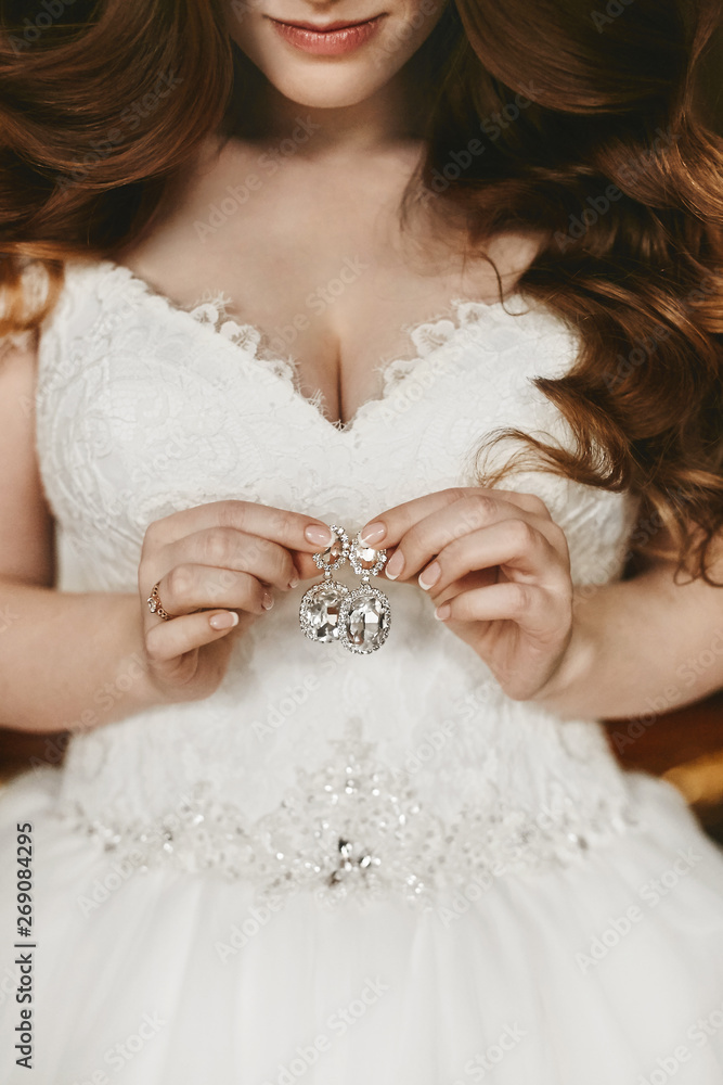 Big luxury earrings with shiny diamonds in the hands of beauty in a wedding dress with big bust and red hair