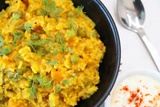 Dal khichadi or Masala Khichdi is a Tasty Indian recipe made of mixed Lentils & rice combined with onions, garlic, tomatoes, Carrots, Peas, cauliflower and beans. Served with Curd or Yogurt & lemon