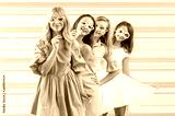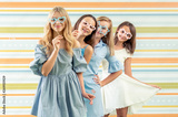 Pretty smiling teenage girls in dresses standing each behind together and holding toy shaped glasses masks at birthday party on the striped colorful background