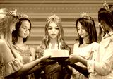 Pretty smiling teenage girls in dresses and crowns holding cake at birthday party od