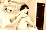 Beautiful pregnant brunette woman with long hair enjoying shoulder and back massage in a beauty room