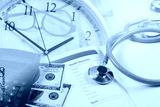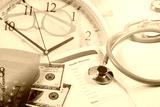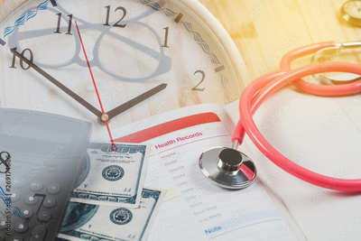 Health records in book note with fountain pen on time background.