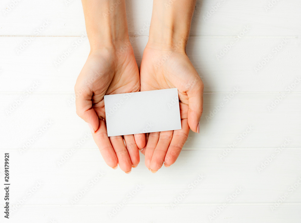 Woman holding white business card in hands. Tamplate for your design.