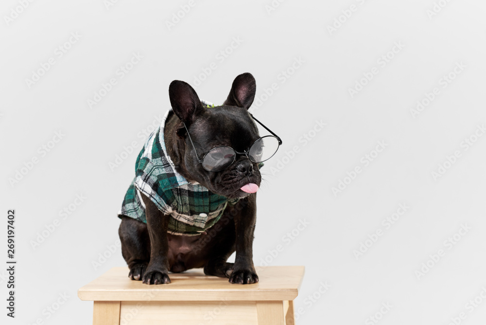 Smart dog. French bulldog in glasses and shirt, very smart and clever. Isolated on white background. Education concept
