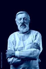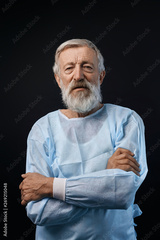 cheerful happy mature patient standing with crossed arms and looking at the camera in the hospital. isolated black background.medicine, free time, spare time, lifestyle