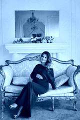 Beautiful young gestation woman in fashionable red evening dress sits on the gold vintage couch at luxury interior decorated with flowers