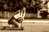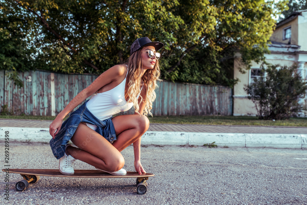 Girl skateboard, summer city, backdrop road asphalt trees, riding on longboard. Free space. Denim sneakers baseball cap. Youth fashion style, modern leisure trend, tanned sports figure.