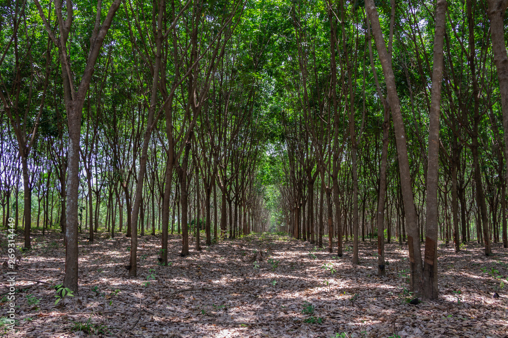 Row of Para rubber tree(Hevea brasiliensis) row agricultural.Green leaves in nature background.