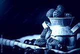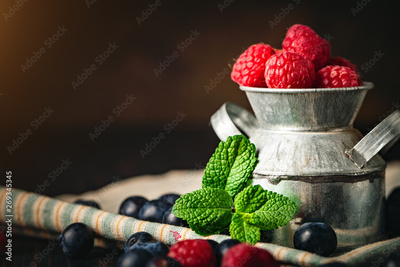 Raspberries and blueberries in a Cup on a dark background. Summer and healthy food concept. Background with copy space. Selective focus. Horizontal.