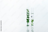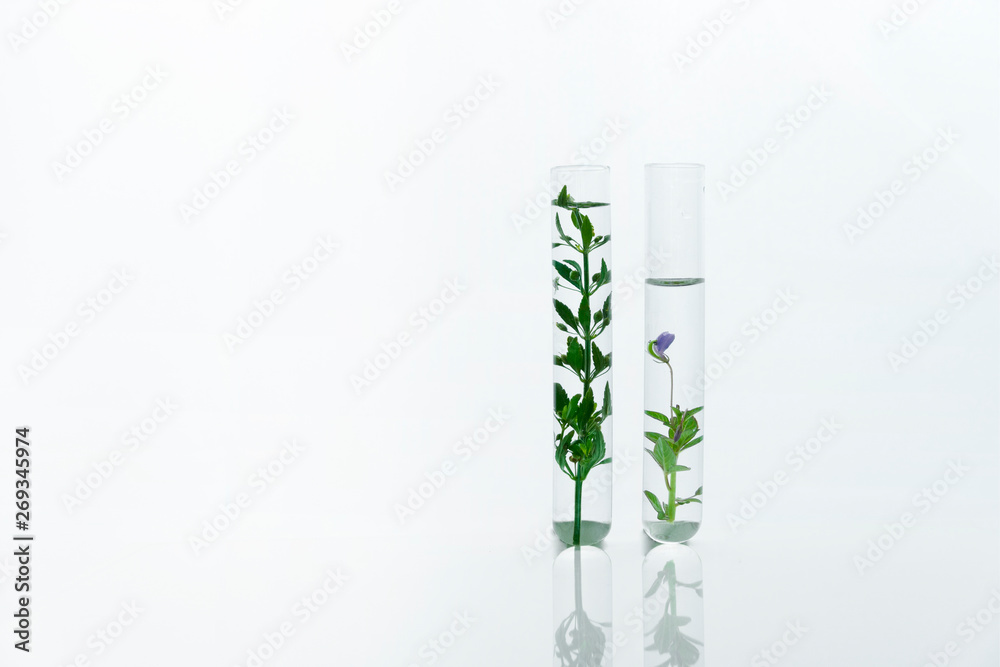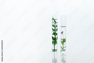 two scientific glass test tube with green plant and purple flower in cosmetic medical laboratory white background