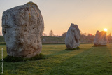 Prehistoric standing rocks at a golden sunset and the sun dipping behind the rocks in a field in Wiltshire, United Kingdom, nobody in the image