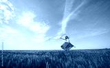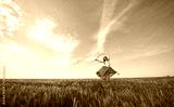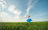 Flying dancer in the air. Happy woman ballerina in blue fabric skirt making a big jump on Green field. Summer or Spring concept