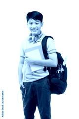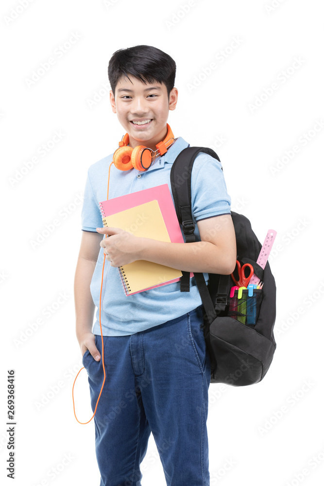 Smiling little student boy in blue polo t-shirt in with books and bag.