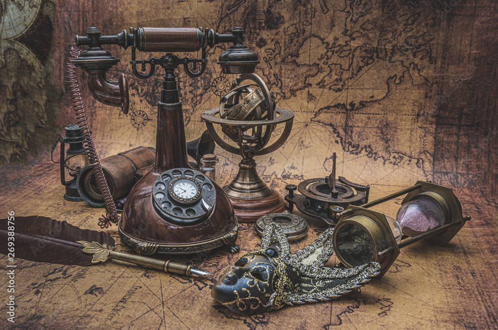 Antique Telephone And Old Collection On Old World Map