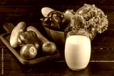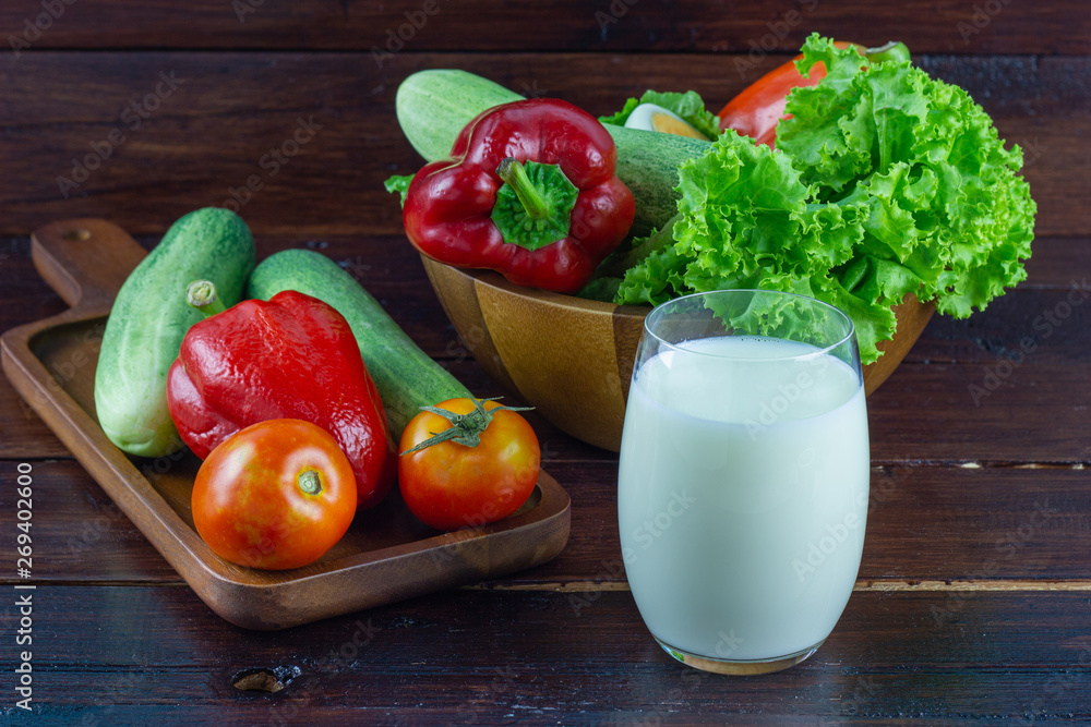 A green salad in wood cup consisting of a mixture With milk in a glass