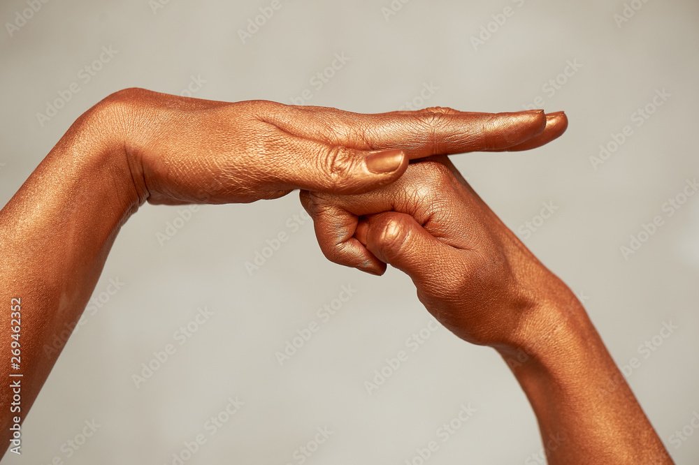 Hands in gold paint, the hands of the artist and creative person. Yoga for hands