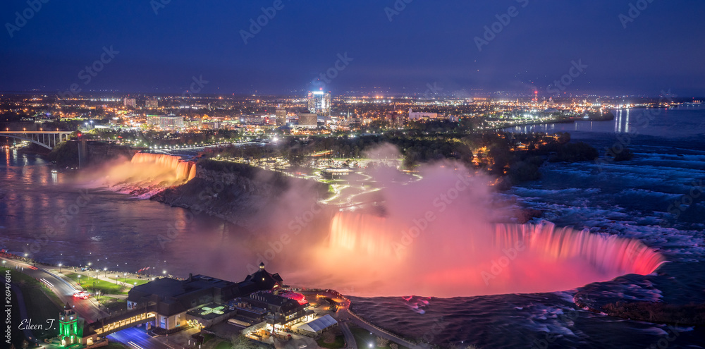 Colorfull lights illuminates the water falls on Niagara Falls in the evening.